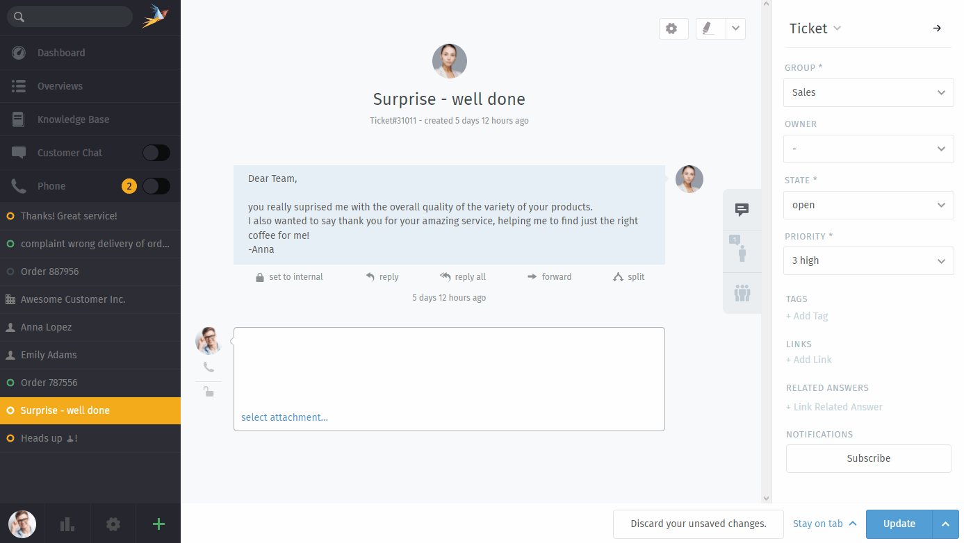Al igual que con los mensajes nuevos, tu respuesta aparecerá al final del hilo. En el fondo, las respuestas se envían a través del mismo canal que el mensaje original (es decir, si el mensaje al que respondiste fue originalmente un tuit, el cliente recibirá tu respuesta en un DM de Twitter).