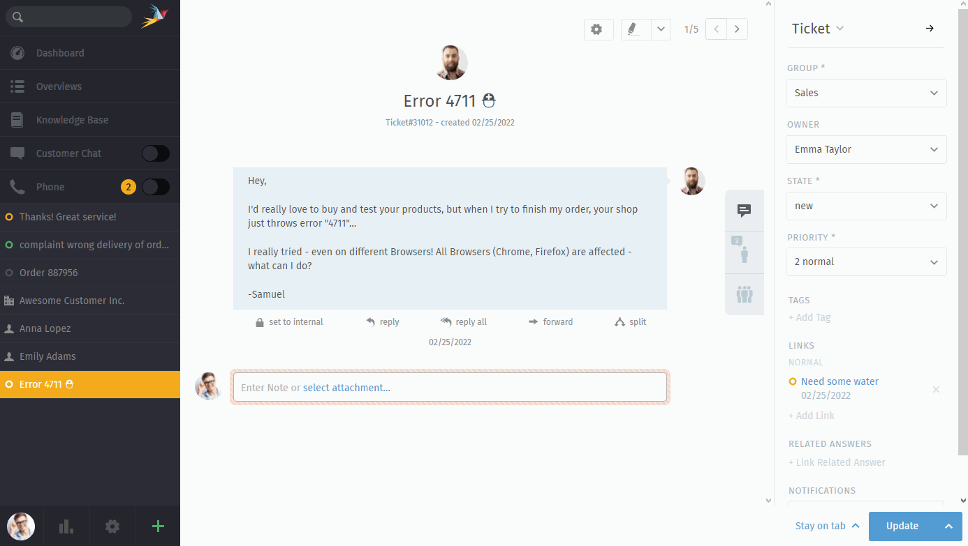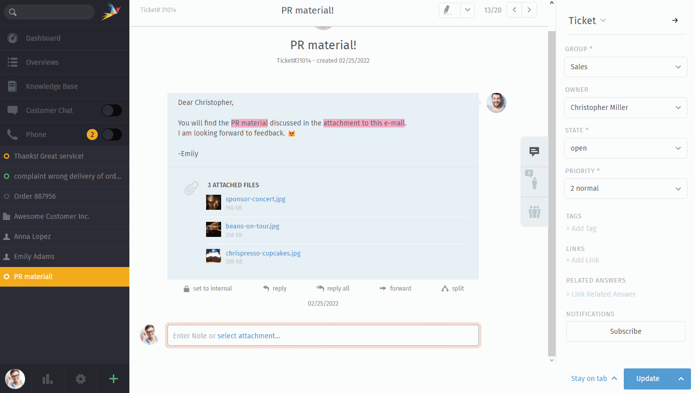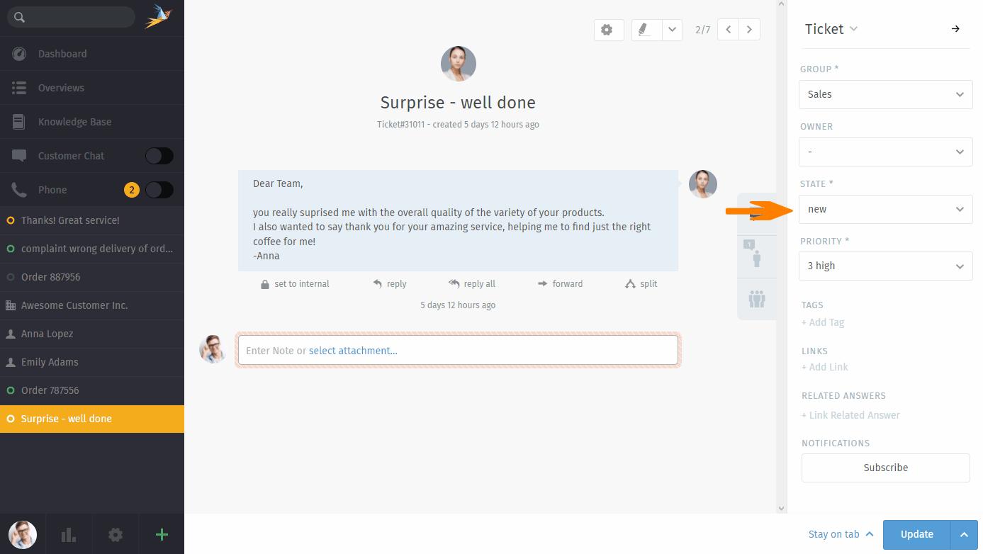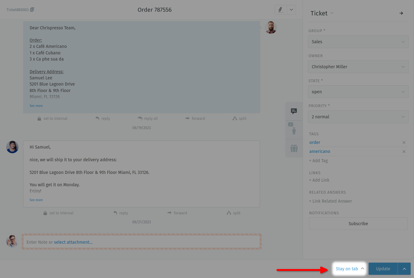 El propietario de un ticket es la persona responsable de él y se asegura de que se procese de la mejor manera posible. Por supuesto, la propiedad se puede transferir a otro agente. En este caso, se recomienda dejar una nota de entrega en el ticket para que el nuevo propietario sepa qué se espera de él.