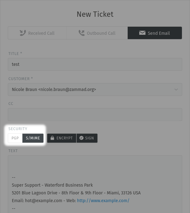 S/MIME es el método más ampliamente compatible para la comunicación segura de correo electrónico. Al activarlo en Zammad, todos los mensajes enviados desde Zammad se firmarán y encriptarán.