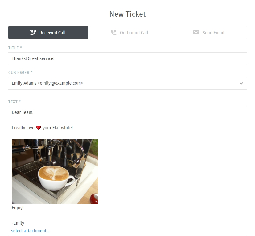 Envía un correo electrónico a cualquiera sobre el ticket. El nombre del ticket se usará para la línea de asunto (haz clic en el título para renombrarlo).